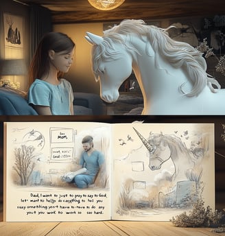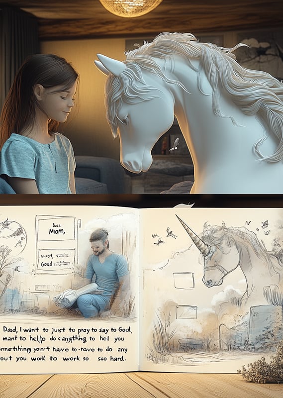 Then she took out a drawing she made at daycare, which had a figure resembling a unicorn. She proudly told her parents that this was a unicorn that could control magic. From a small unicorn to a big one, all the patterns on the drawing were part of the big unicorn. Once the small unicorns become big unicorns, they will be able to use magic to help her parents.